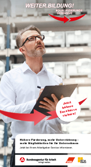 Nutzen Sie diesen Vorteil und informieren Sie sich bei Ihrer zuständigen Agentur für Arbeit oder Jobcenter über aktuelle Förderprogramme. Arbeitgeber wenden sich direkt an den Arbeitgeberservice der Agentur für Arbeit.